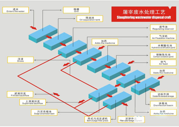 屠宰廢水處理工藝流程介紹,廢水進入格柵池,經格柵去除大塊懸浮物,后自流進入隔油池,去除廢水中部分油脂,后流入調節池,調節池中的水位處于高液位時水泵自動啟動:泵入一體化氣浮裝置處理去除大量的細小懸浮物及油脂,清水通過溢流管進入水解酸化池。
