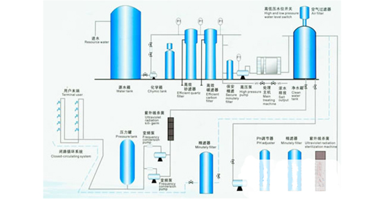 自來水(或其他水源) → 一級水處理 → 二級水處理 → 三級水處理 → 精處理 → 膜分離系統 → 殺菌消毒 → 用戶