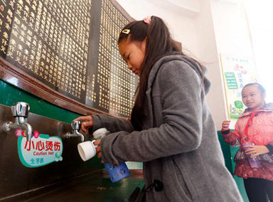 校園直飲水設備解決了高山地區(qū)學生冬天飲水問題。13歲的潘鈺琳說,現(xiàn)在教室安了校園直飲水機,食堂每周一還可以吃上羊肉。