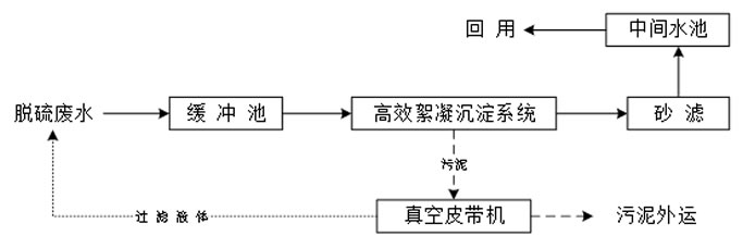用于脫硫的循環水主要目的是去除煙氣中的二氧化硫和氮氧化物等物質,所以對回用水質沒必要過于高,鑒于此我們使用如下工藝即可滿足使用要求。脫硫廢水中水回用、零排放工藝: