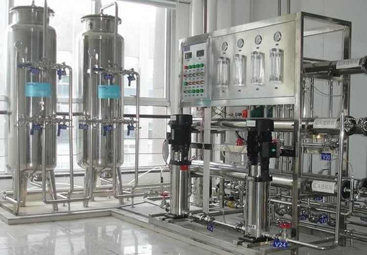 原水箱→增壓泵→ 全自動(dòng)多介質(zhì)過濾器→全自動(dòng)活性炭過濾器→全自動(dòng)軟化水器→精密過濾器→一級(jí)反滲透裝置→PH調(diào)節(jié)→二級(jí)反滲透主機(jī)→純水箱→純水泵→微孔過濾器→用水點(diǎn)