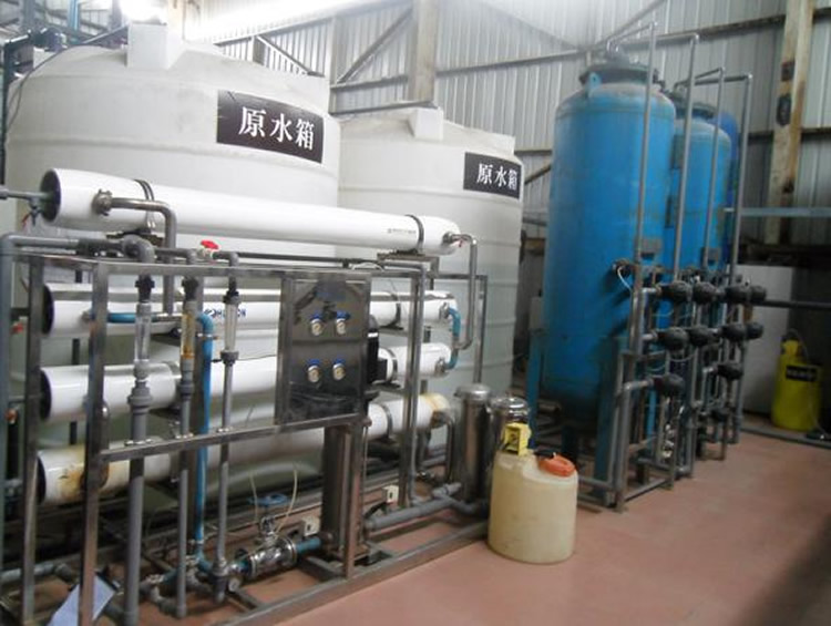 原水→原水加壓泵→多介質(zhì)過濾器→活性炭過濾器→軟水器→精密過濾器 →第一級反滲透→PH調(diào)節(jié)→中間水箱→第二級反滲透(反滲透膜表面帶正電荷)→純化水箱→純水泵→微孔過濾器→用水點
