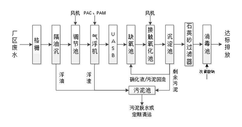 食品加工廢水的處理預處理部分主要包括:粗(細)格柵、沉砂池、隔油池、氣浮池、集水池、調節池和初沉池等。生化處理部分主要包括厭氧處理和好氧處理。一般采用的厭氧工藝為UASB和水解酸化;好氧工藝一般采用SBR工藝和生物接觸氧化技術,有條件時亦可采用膜生物反應器工藝。
