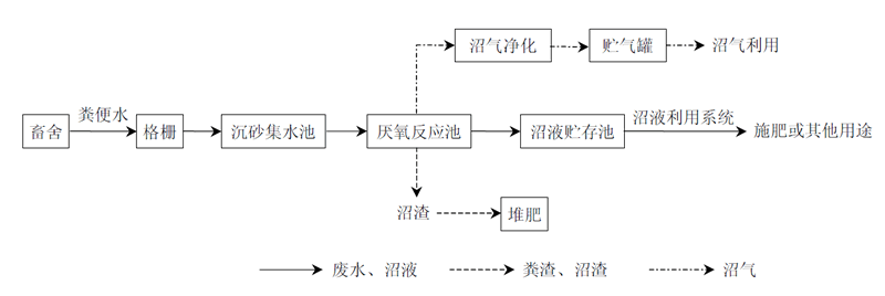 適用于能源需求不大,主要以進行污染物無害化處理、降低有機物濃度、減少沼液和沼渣消納所需配套的土地面積為目的,且養殖場周圍具有足夠土地面積全部消納低濃度沼液,并且有一定的土地輪作面積的情況。