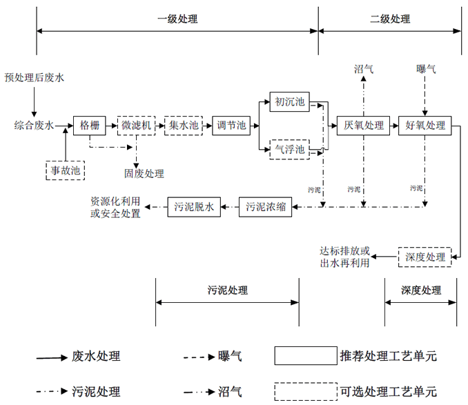 一級(jí)處理指以沉淀、氣浮等固液分離措施為主體的初級(jí)凈化過(guò)程,以減輕后續(xù)處理工藝負(fù)荷;二級(jí)處理主要指生化處理工藝;深度處理為根據(jù)不同處理要求采用更進(jìn)一步的處理過(guò)程。
