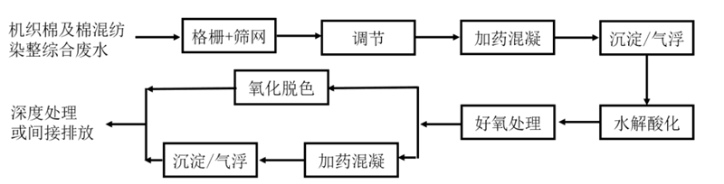 (1)機織棉及棉混紡染整綜合廢水常規處理宜采用前物化+生化+后物化組合工藝
