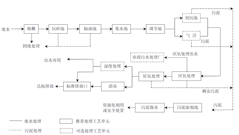預處理去除油脂和SS,調整PH,吹脫H2S等,以減輕廢水的腐敗程度和生化處理的負荷;根據出水要求設計不同的生物處理工藝,當污水以排放市政污水處理廠為處理要求時采用厭氧生物處理工藝,當以附近排放為處理要求時宜采用厭氧、好氧生物處理相結合的處理工藝,當以水回用為處理要求時,需在厭氧、好氧工藝后加設深度處理工藝。
